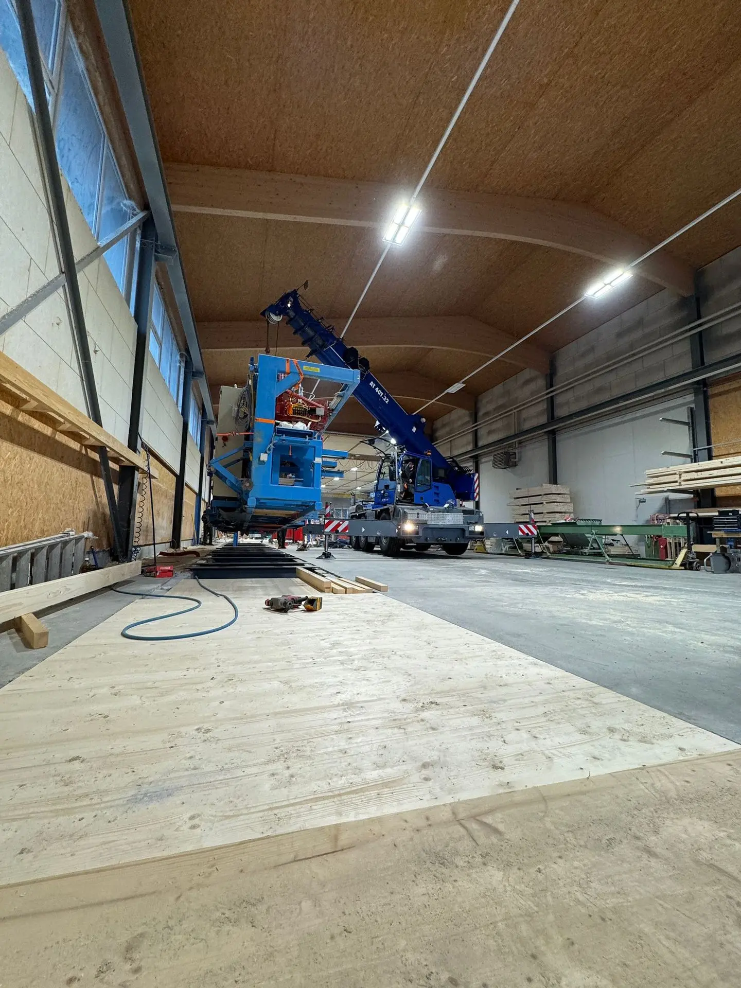 Um auch die Plattenbearbeitung technisch auf den neuesten Stand zu bringen, wurde die Hundegger SPM 2 durch ein innovatives Nestingzentrum von HOMAG ersetzt: die CENTATEQ P-510. Beschickt wird diese mit einem neu aufgestellten Handlingskran von Fezer. Für den Elementbau kommen Montagetische von Fankhauser zum Einsatz. Neu: Die Länge der Tische wurde wesentlich erhöht, vor allem aber stehen neben ihnen nun Halbportalkräne zur Verfügung, die für ein Plus an Effizienz und Ergonomie sorgen. Damit kann jetzt ein Mitarbeiter allein die Platten auf die Elemente aufbringen oder ganze Elemente wenden und transportieren. Die Bedienung ist einfach – Lasten bis 1000 kg lassen sich leicht bewegen.